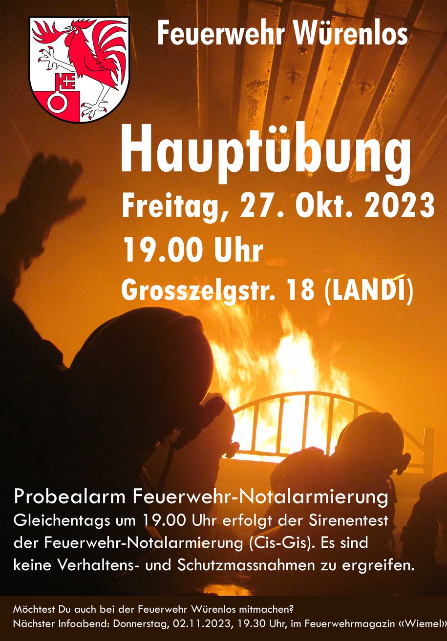 Am Freitag, 27. Oktober 2023, 19.00 Uhr, findet die jährliche Hauptübung der Feuerwehr Würenlos statt. Übungsobjekt: Grosszelgstrasse 18 (LANDI Würenlos). Die Bevölkerung ist herzlich eingeladen, die Übung mitzuverfolgen.